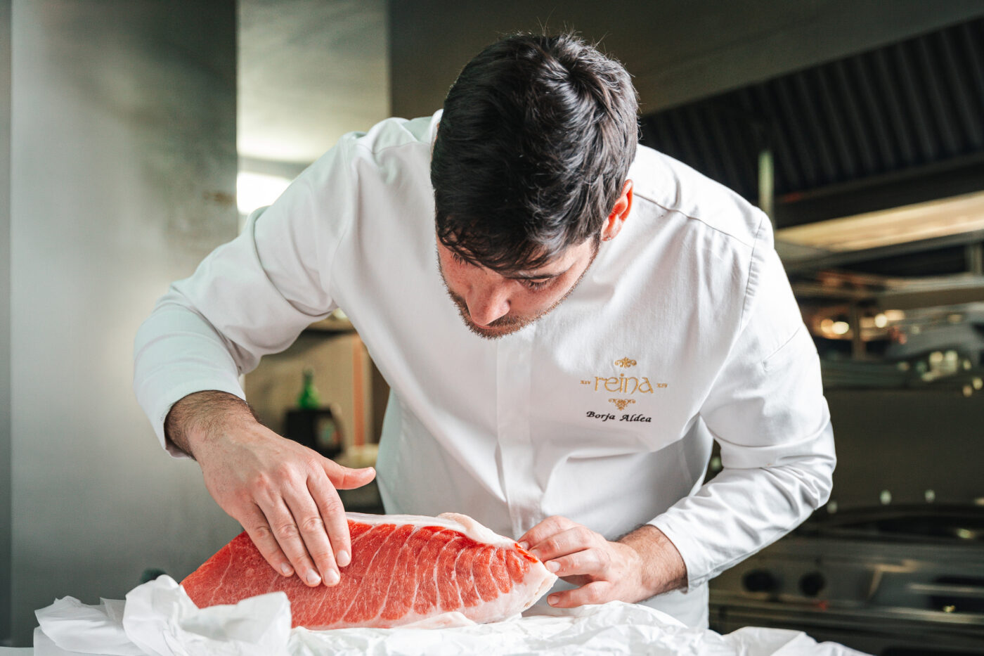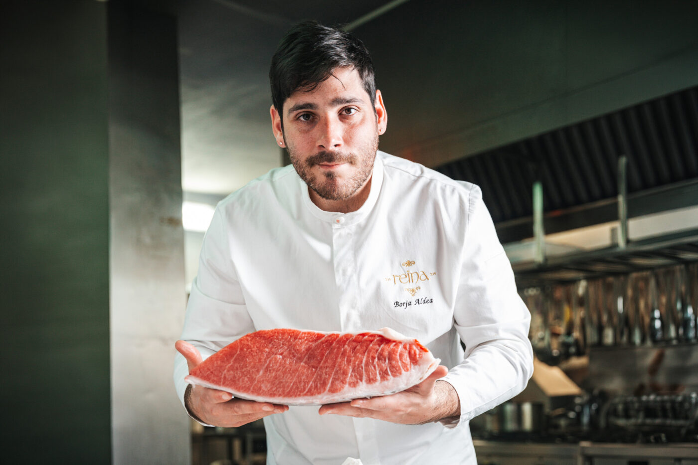 A este imparable cocinero le estimula «desde elegir una buena pieza hasta el corte preciso con el cuchillo. Son momentos que me conectan con el oficio, con la paciencia y el respeto por el producto. Cocinar atún rojo me hace sentir que estoy creciendo, que estoy construyendo mi identidad a través de ingredientes que valoro”. Su corte preferido son la parpatana y la carrilera de atún. Por tanto, no es casualidad que uno de los platos icónicos en Reina XIV sea el pithivier de carrillera de atún rojo Fuentes, un guiso meloso de carrillera, envuelto en hojaldre y horneado, servido con una salsa perigordina (trufa y foie) y puré de patata estilo Robuchon. Además, fuera de carta ofrecen, entre otros pases, Parpatana Pesto hierbas apio nabo y demo de sus espinas; Morrillo de atún – brasa salsa espinaca; Ventresca – soasada en escabeche de pollo o Lomo atún – Tataki a la segoviana
