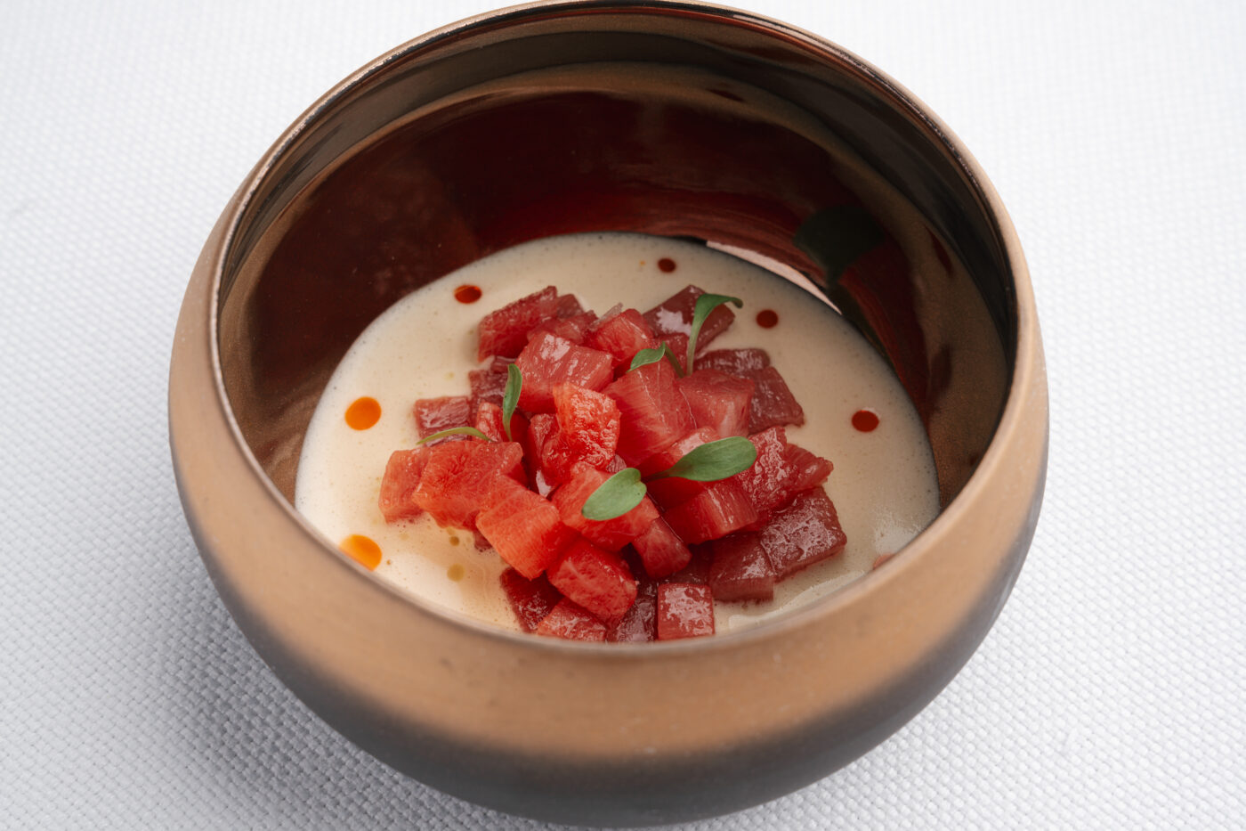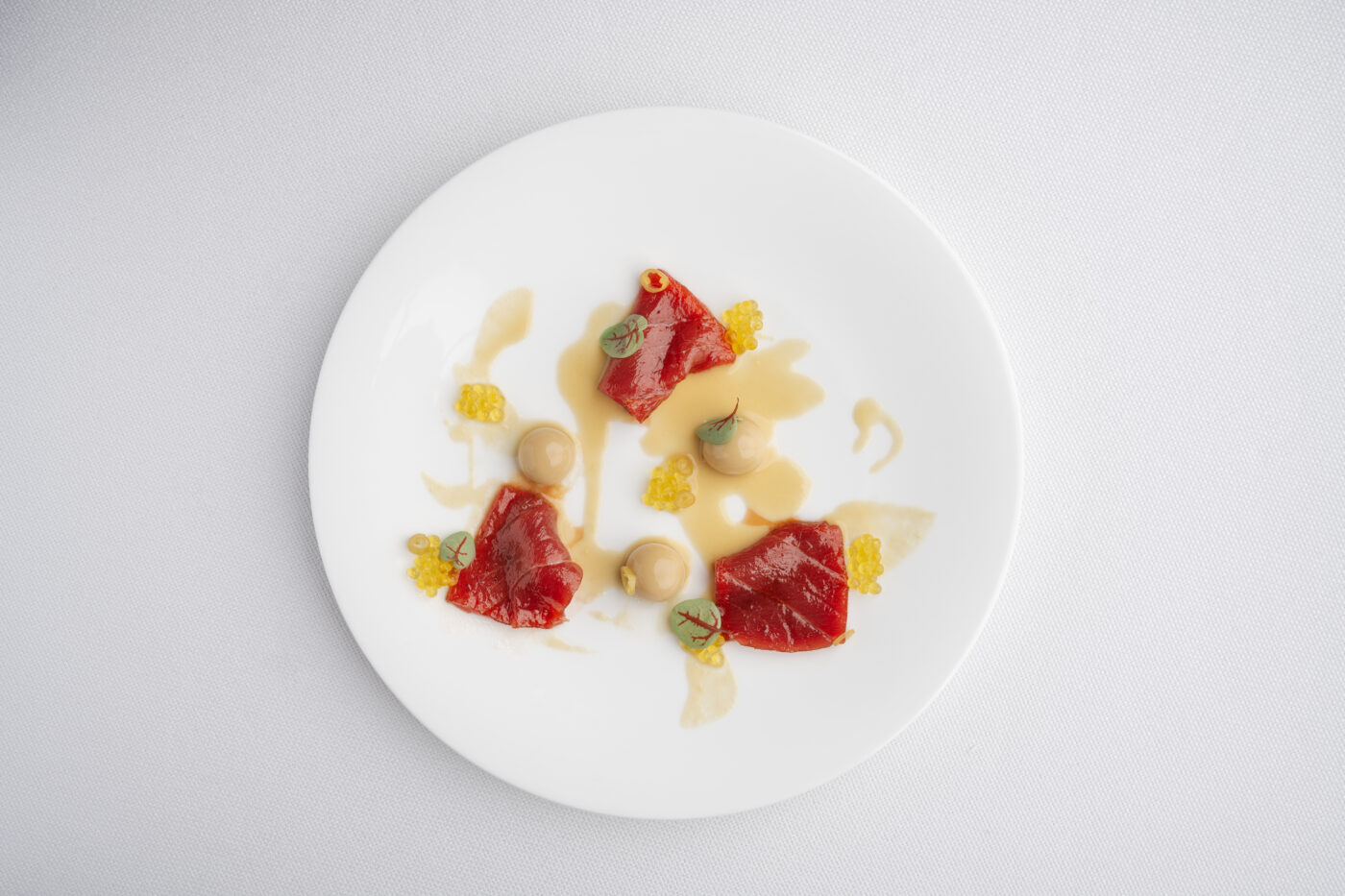 En este gastronómico que honra las materias primas de calidad, el atún rojo Fuentes está muy presente. «Me gusta cocinar atún rojo porque estoy trabajando con uno de los productos más nobles y exigentes que existen. No es solo un ingrediente, es un reto. Cuando elaboro un plato con atún rojo debo estar a la altura de su calidad, respetando su textura, su sabor profundo y su frescura. Además, el atún rojo me permite explorar técnicas y creatividad. Puedo tratarlo como una carne, marcándolo a la plancha o mantenerlo crudo para resaltar su pureza. Esa versatilidad me motiva a seguir aprendiendo, a probar combinaciones nuevas y a entender mejor el equilibrio entre tradición e innovación”, explica Aldea.